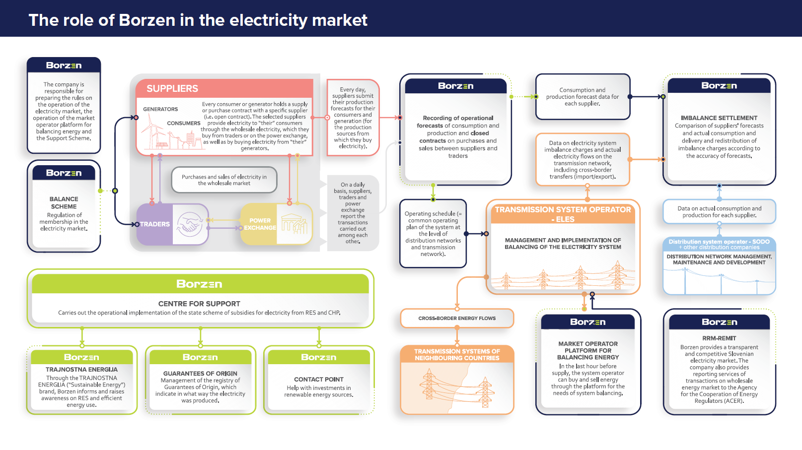 The core activity of Borzen is the provision of the public service of electricity market operator and a compulsory national public service of the Centre for Support.